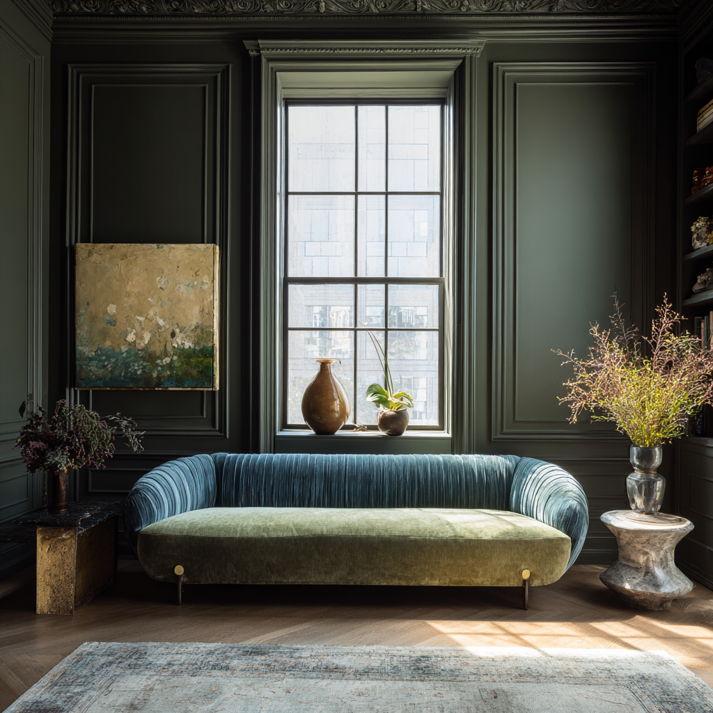 A deep, verdant green inspired by dense, thriving leaves in a forest canopy. This rich, organic shade brings the essence of nature indoors. Its lush depth creates a feeling of abundance and vitality.